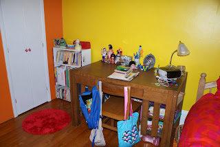 Although she can’t peer enough at herself these days, Girl opted for a desk rather than the vanity with full-length mirror that used to reflect my twirls. Because she likes papers and pens, her feeling was that a desk would serve her better.