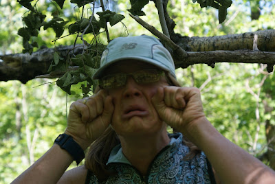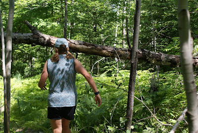 Wearing a cap, and being careful to watch the path for roots and rocks, I didn’t notice the birch tree blocking the path—suspended between two other trees—just at head level.