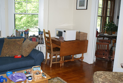 A shot of the dining room, after we cleared it out on Sunday. Note the refrigerator on the left. I like a fridge that serves as maitre d’ to everyone entering the house.