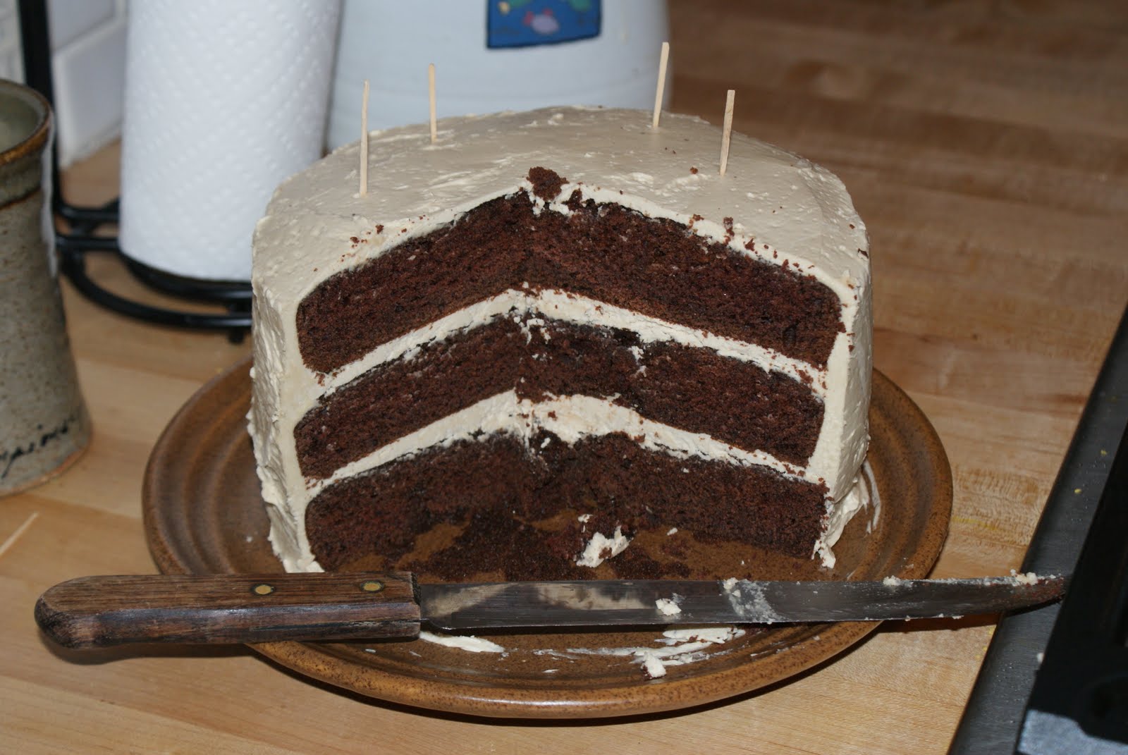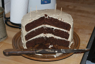 Clearly, the Kindle was a birthday highlight. Another highlight was the cake Groomeo made me–a little something from a Gourmet cookbook involving chocolate devil’s food cake and brown sugar buttercream.