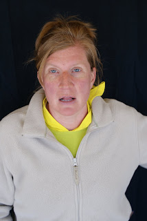 And then there’s the photo Groom took of me yesterday when he was setting up a backdrop and stool for his latest digital photography class assignment of “taking portraits.” Trust me, I wasn’t his true subject. Before the real guy showed up, I was simply helping him take some sample shots so he could judge the lighting. We quickly realized that my glasses were creating a glare, so I dropped those.