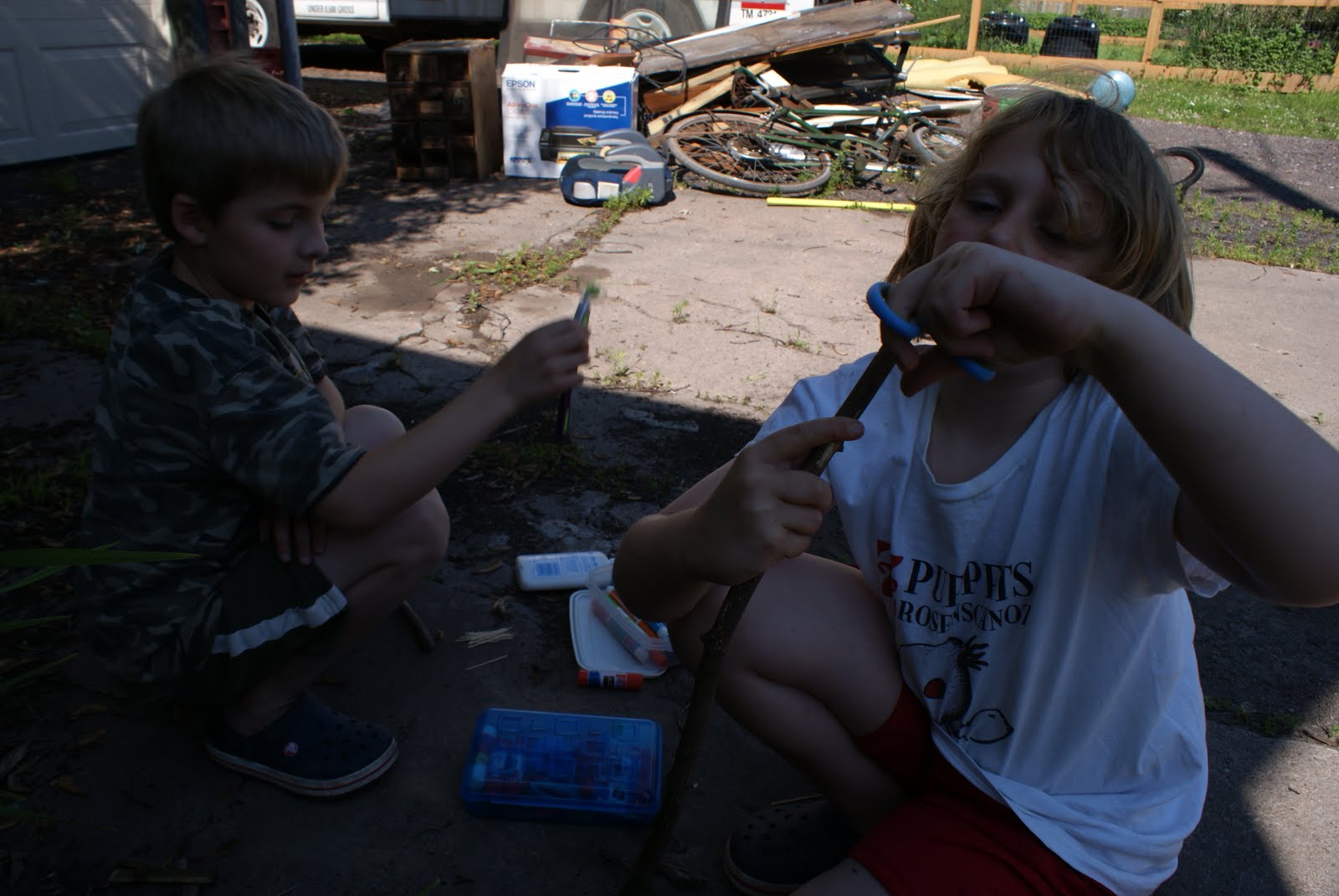 As junk stacked up, awaiting departure, Paco and his buddy worked on whittling and glueing magic wands.