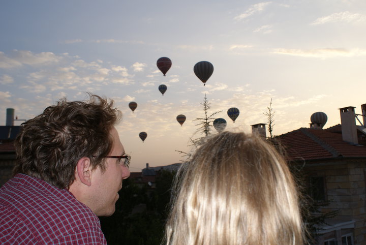 Paco was so wacked that he slept through the first Call to Prayer that next morning, but Groom, Girl and I woke up and stayed awake, which provided the side benefit of watching the take-off of nearly 40 hot air balloons (one of Goreme’s tourist mainstays). While the recording of the Call to Prayer kind of cracks me up because it ends with a static-y “thump,” as though the singer of the meuzzin is a sort of Johnny Rotten throwing the mic to the stage and stomping off after an encore of “Anarchy in the U.K.,” the sounds of the propane fires in the sky at 5:00 a.m. are more mystical, like dragons raining down to invade the village. A person not sufficiently worn down by Seussian adaptation could hardly be expected to sleep, really.